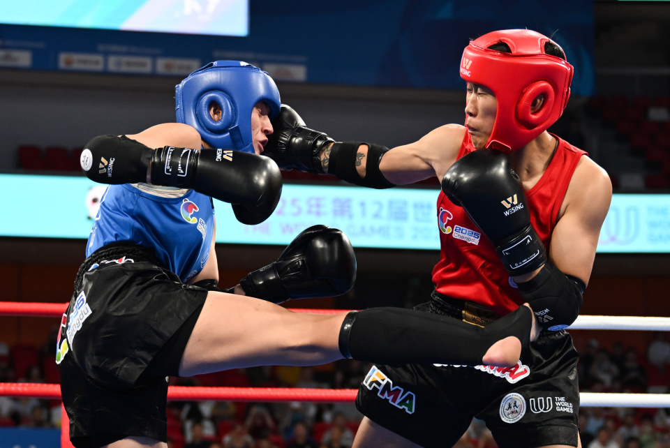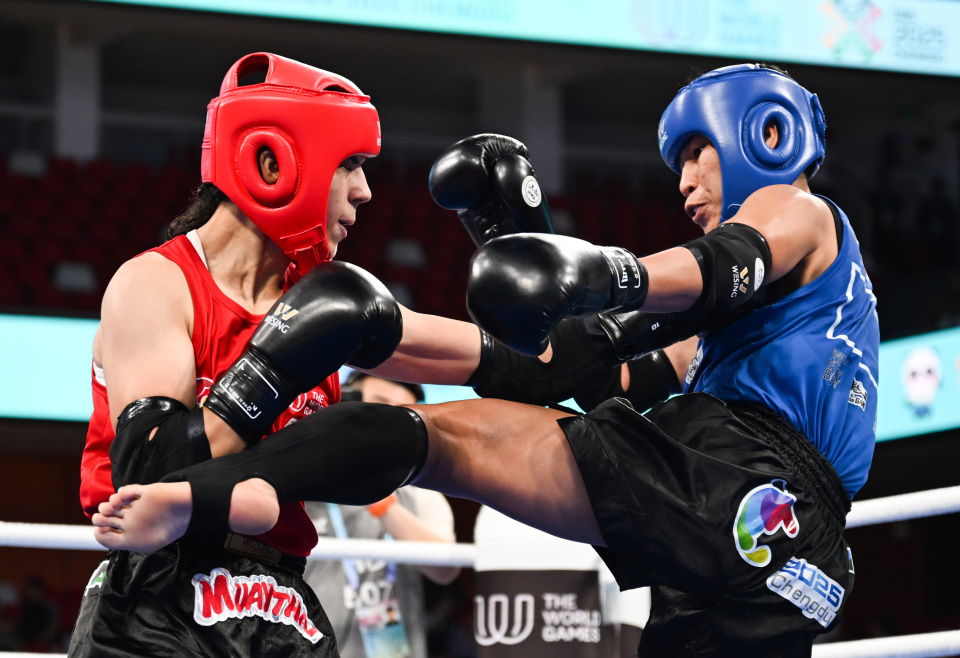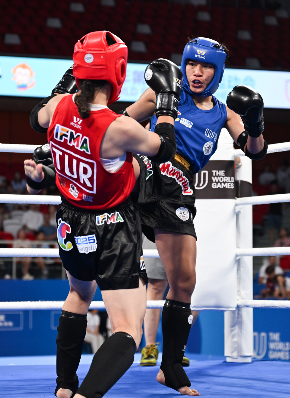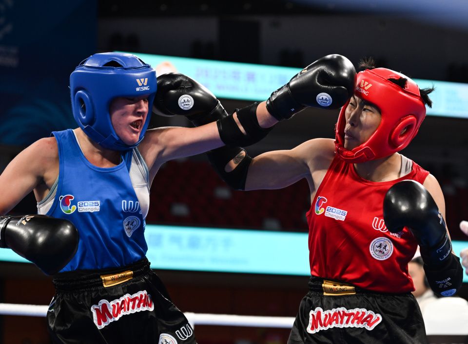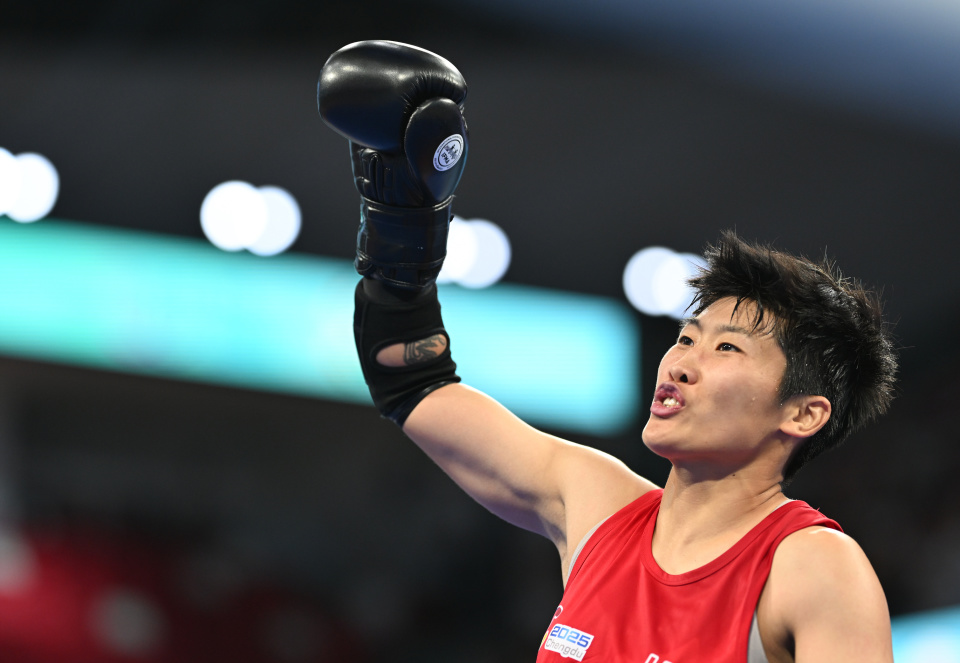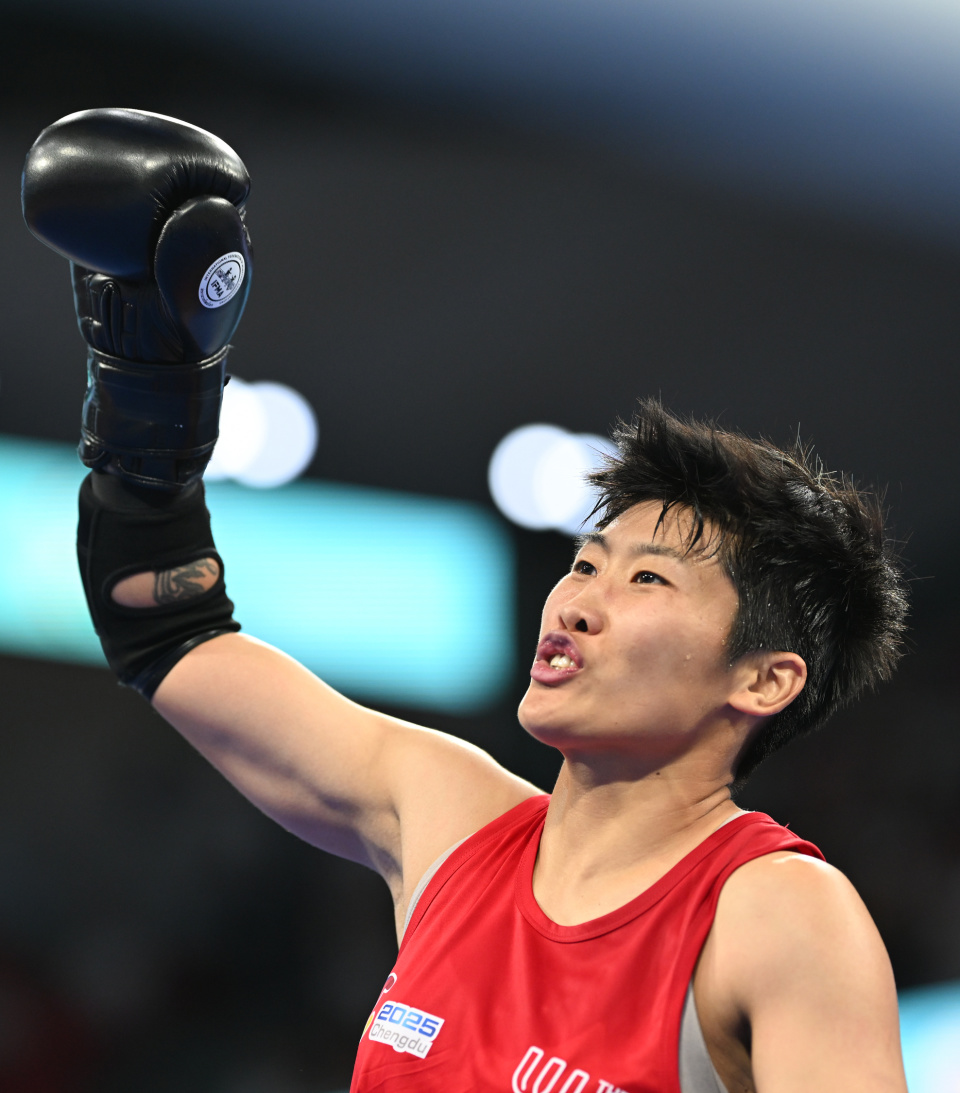 当日,2025年成都世运会泰拳女子60公斤级半决赛举行。8月9日,中国选手韩鑫在比赛后庆祝。最终,她晋级决赛。新华社记者 张博文 摄